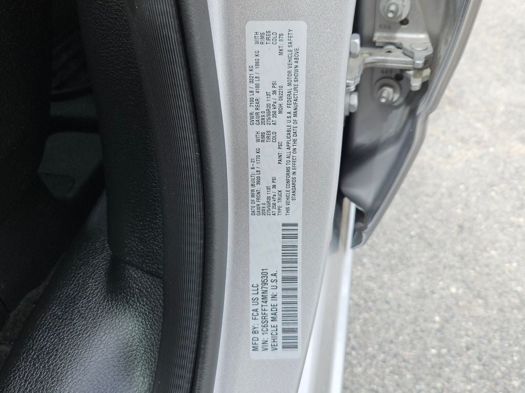 Big Horn Level 2 Equipment Group (115V Auxiliary Power Outlet, 400W Inverter, and ParkSense Front/Rear Park Assist w/Stop), Quick Order Package 27Z Big Horn, 3 Rear Seat Head Restraints, 3.21 Rear Axle Ratio, 4 Way Front Headrests, 4-Wheel Disc Brakes, 40/20/40 Split Bench Seat, 48V Belt Starter Generator, 6 Speakers, ABS brakes, Air Conditioning, Alloy wheels, AM/FM radio, Black Exterior Mirrors, Brake assist, Bumpers: chrome, Cloth Bench Seat, Compass, Delay-off headlights, Driver door bin, Dual front impact airbags, Dual front side impact airbags, Electronic Stability Control, Front anti-roll bar, Front Center Armrest w/Storage, Front fog lights, Front License Plate Bracket, Front reading lights, Front Seat Back Map Pockets, Front wheel independent suspension, Fully automatic headlights, GPS Antenna Input, Heated door mirrors, Illuminated entry, Integrated Voice Command w/Bluetooth®, Leather steering wheel, Low tire pressure warning, Manufacturer's Statement of Origin, MOPAR Front & Rear Rubber Floor Mats, Occupant sensing airbag, Outside temperature display, Overhead airbag, Overhead console, Panic alarm, ParkView Rear Back-Up Camera, Passenger door bin, Passenger vanity mirror, Power door mirrors, Power steering, Power windows, Radio data system, Radio: Uconnect 3 w/5 Display, Radio: Uconnect 4 w/8.4 Display, Rear 60/40 Folding Seat, Rear anti-roll bar, Rear seat center armrest, Rear step bumper, Rear Wheelhouse Liners, Remote keyless entry, Remote Start System, Speed control, Split folding rear seat, Steering wheel mounted audio controls, Tachometer, Telescoping steering wheel, Tilt steering wheel, Traction control, Trip computer, Variably intermittent wipers, Voltmeter, Wheels: 18 x 8 Cast-Aluminum Painted, and Wheels: 20 x 9 Aluminum Chrome Clad (WRK)